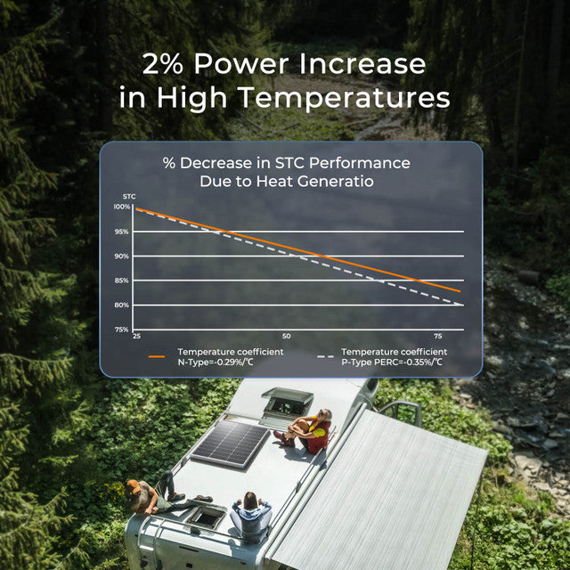 Renogy's N-Type Solar Panels set a new standard in solar efficiency, outperforming traditional p-type PERC panels. With superior cell efficiency, an extended lifespan, and consistent high performance, these panels are designed to deliver reliable energy in any condition.